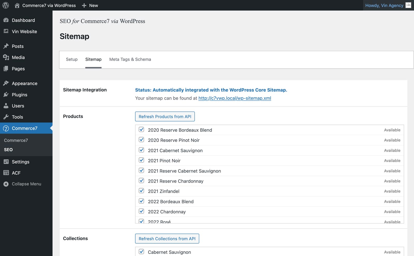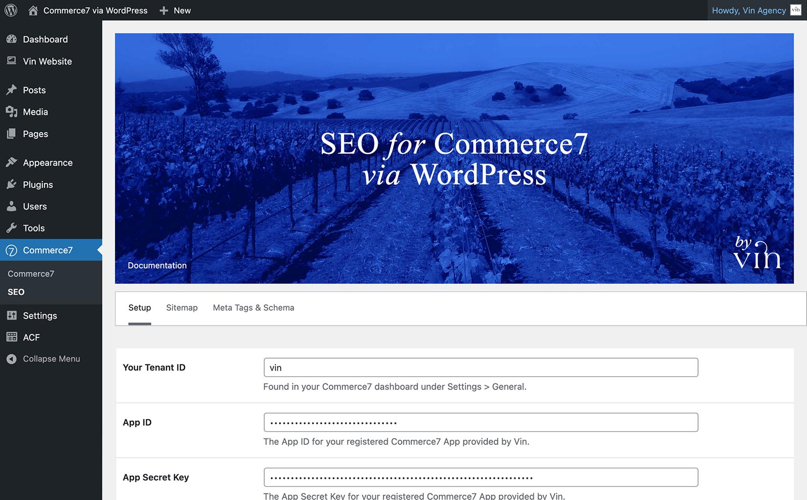 Setup is a two-part process in Commerce7 and WordPress. After purchasing this plugin, Vin will enable you to install the app in Commerce7 and follow up with information about installing the plugin in WordPress.